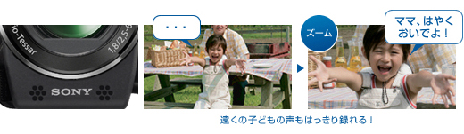映像のズームに連動して、音声もズーム。離れた人物の声や、動物の鳴き声などをしっかり録音。思い出のシーンを臨場感いっぱいに残せます。