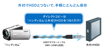 USBアダプターケーブル(別売)を使って、“ハンディカム”と外付けハードディスクを接続すれば、かんたんに撮影した映像を保存できます。さらにテレビでの再生も楽しめます。