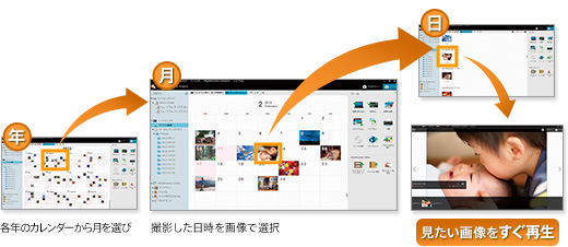 カレンダー表示で撮った映像をかんたんに整理・検索・再生が行えます。“ハンディカム”とパソコンをつなぐだけで、カメラ内の映像を取りこまなくても見ることができます。パソコンに取りこんでブルーレイディスクやDVDを作成したり、その他の便利な機能を使ったり、楽しくかんたんに管理、活用できます。