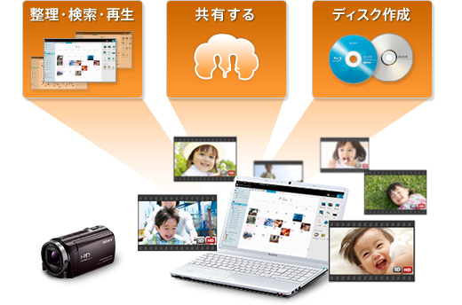 カレンダー表示で撮った映像をかんたんに整理・検索・再生が行えます。“ハンディカム”とパソコンをつなぐだけで、カメラ内の映像を取りこまなくても見ることができます。パソコンに取りこんでブルーレイディスクやDVDを作成したり、その他の便利な機能を使ったり、楽しくかんたんに管理、活用できます。