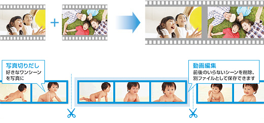 複数の動画を結合してひとつのビデオファイルとして保存できる動画結合機能や簡易動画編集、写真の切りだしがかんたんにできます。