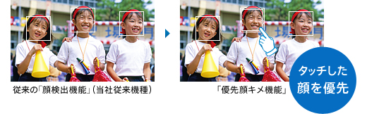 「顔検出機能」がさらにパワーアップ。カメラが検出した複数の人物の中から、特定の顔にタッチすれば、選択した人物を優先的に、フォーカスはもちろん、明るさや肌の色まで最適化します。選択した人物が画面から外れたり、本体の電源を切っても、優先設定は継続するのでとても便利。さらに「スマイルシャッター」にも連動。選んだ人物の笑顔の写真を、優先的に自動で撮影します。