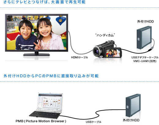 USBアダプターケーブル(別売)を使って、“ハンディカム”と外付けハードディスクを接続すれば、かんたんに撮影した映像を保存できます。さらにテレビでの再生も楽しめます。