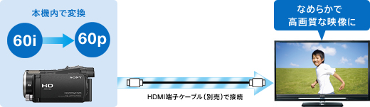 HDMI端子ケーブル(別売)で、プログレッシブ対応のハイビジョンテレビに接続すれば、インターレースで記録されているAVCHD映像を、プログレッシブフルハイビジョンに変換して出力。なめらかな高画質の映像を楽しめます。