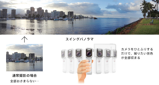 “ハンディカム”を一振りするだけで、広角でも入りきらない雄大な自然や、美しい建築物など、最大172度までの壮大なパノラマ写真を撮影できます。さらに、「顔・動き検出」にも対応し、人物をよりキレイに再現するパノラマ撮影が可能です。撮影時には上下左右4つのスイング方向と、スタンダード、ワイドの2種類の画像サイズを選択できます。