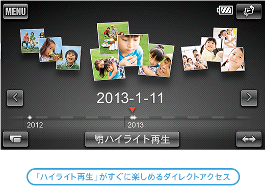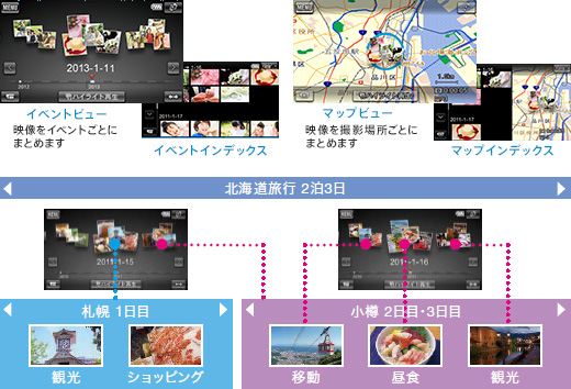 また、「GPS機能」対応モデルなら「マップビュー」にも対応。札幌、小樽など撮影場所ごとにまとめた映像が、かんたんに探せます。さらに、イベントごとの「ハイライト再生」も楽しめます。