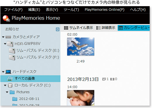 カレンダー表示で撮った映像をかんたんに整理・検索・再生が行えます。“ハンディカム”とパソコンをつなぐだけで、カメラ内の映像を取りこまなくても見ることができます。パソコンに取りこんでブルーレイディスクやDVDを作成したり、その他の便利な機能を使ったり、楽しくかんたんに管理、活用できます。