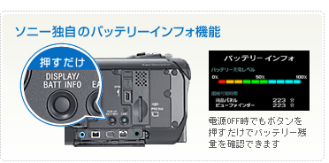 バッテリーはたっぷり撮れる“スタミナ”最大6時間(*)。しかも、残量が分単位で表示されるので、バッテリー交換のタイミングが一目でわかり、撮影中のバッテリー切れを防げます。
