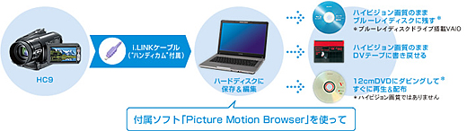 ハイビジョン対応の「VAIO」とi.LINK接続すれば、テープに撮ったハイビジョン映像をハイビジョン画質のまま保存・編集できます。DVDへのダビングもかんたんです。
