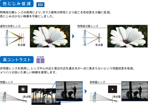 ソニー独自の光学技術を結集した、高性能「Gレンズ」を搭載。特殊低分散レンズ、非球面レンズを採用し、レンズ群全体の小型化を実現しました。