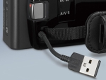 USBケーブルを内蔵しているので、とても便利。パソコンとの接続はもちろん、接続したパソコンからも充電できます。USBケーブルは、ハンドストラップの中に収納できるようになっているので撮影中でも気になりません。