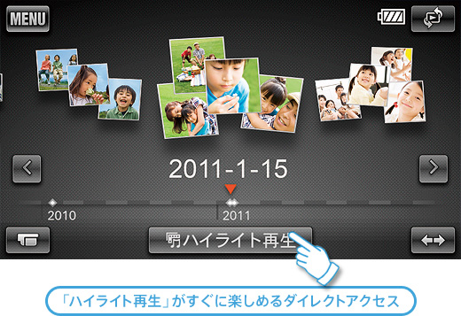 カメラが撮影の頻度を検知。撮影日時情報と合わせて映像を自動的にイベントごとにまとめます。再生画面上で並んでいた映像も、これからは結婚式や運動会などのイベント別にかんたんに楽しめます。