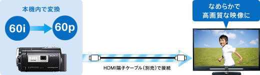 HDMI端子ケーブル(別売)で、プログレッシブ対応のハイビジョンテレビに接続すれば、インターレースで記録されているAVCHD映像を、プログレッシブ フルハイビジョンに変換して出力。なめらかな高画質の映像を楽しめます。
