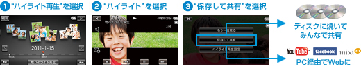 「ハイライト再生」を、パソコンやDVDライターを使ってDVD(SD画質)に記録したり、インターネットにアップしたりする(アップ時はWMVファイル)のも“ハンディカム”なら、とてもスムーズ。画面表示に従って選択していくだけで、かんたんにできます。