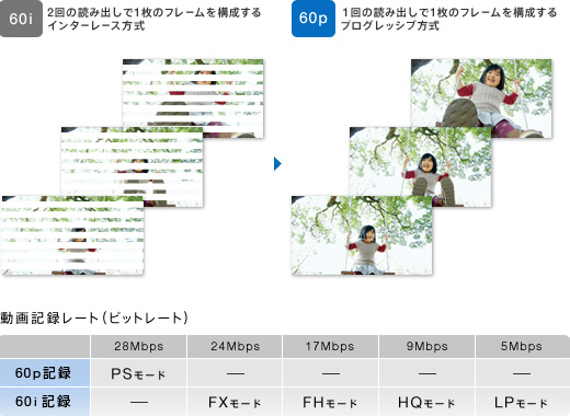 2回の読み出し時間をかけて1フレームを構成するインターレース方式に比べて、1回の読み出しで1フレームを構成するプログレッシブ方式。プログレッシブ方式は時間当たり約2倍の情報量なので、より高精彩な記録を実現します。
