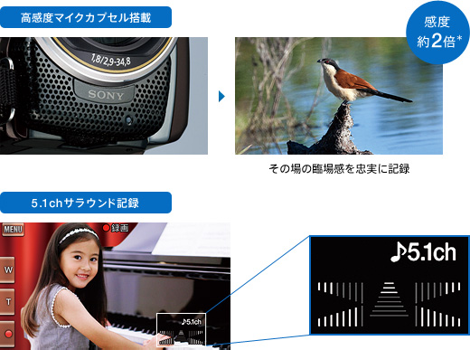 また、ドルビーデジタル5.1chのサラウンド記録ができます。ズームに連動して音声レベルも変化。対応する機器で再生すれば、思い出のシーンが臨場感いっぱいに甦ります。