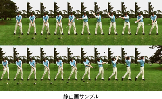 一連の動きを動画と連続写真で作成。インパクトの瞬間をより細かいコマ数で撮影し、1コマずつ再生したり、静止画で全コマの一括表示も可能。フォームチェックなどに便利です。