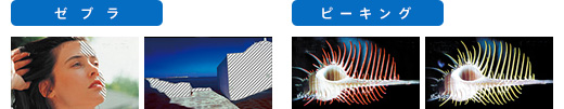 液晶画面やビューファインダー上に、輝度の高い部分のみに縞状の模様をつけるゼブラ表示。ゼブラを表示させれば明るさを調整する際の目安として使用でき、白とびを防止できます。また、輪郭を強調して表示しピントを合わせやすくするピーキングは、マニュアルフォーカスで撮影する場合に便利です。