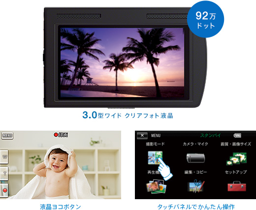 タッチパネル採用、直感的な操作ができる 3.0型ワイド液晶パネル