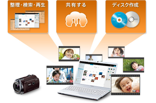 カレンダー表示で撮った映像をかんたんに整理・検索・再生が行えます。“ハンディカム”とパソコンをつなぐだけで、カメラ内の映像を取りこまなくても見ることができます。パソコンに取りこんでブルーレイディスクやDVDを作成したり、その他の便利な機能を使ったり、楽しくかんたんに管理、活用できます。