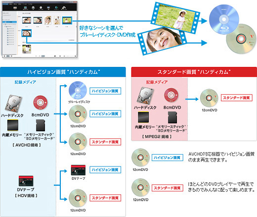 ブルーレイディスクは60i/24pのハイビジョン動画に加え、60p映像も作成できます(*1)。DVDはハイビジョン/スタンダードのどちらの画質でも作成できます(*2)。“ハンディカム”の対応記録画質と使用メディアに応じて、それぞれのスタイルで作成・再生できます。