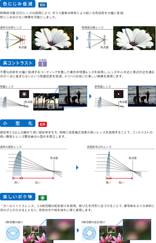 不要な反射を抑え、より忠実な色再現性を実現する、カールツァイス「バリオゾナーT*レンズ」を搭載しました。色収差を大幅に補正するED(特殊分散)ガラスや球面収差を補正する非球面レンズ、高い収差補正効果を発揮するERレンズ(高屈折率レンズ)を採用。高コントラストで、解像感のある高画質を実現しています。また、虹彩絞りの採用により、美しいボケ味を生かした表現も楽しめます。