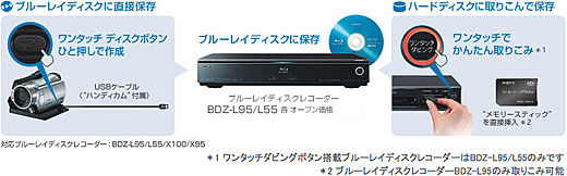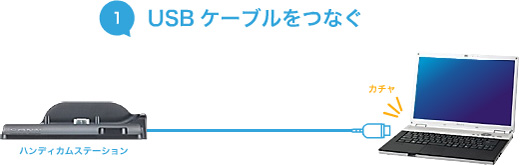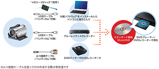 “ハンディカム”を付属のUSBケーブルでDVDライターに接続し、ハンディカムステーションのワンタッチディスクボタンをひと押し。パソコンを使わずに、ハイビジョン画質DVDを手軽に作成できます。“メモリースティック”に記録されたハイビジョン映像を DVDライターの“メモリースティック デュオ”スロット経由でダビングもできます(*)。