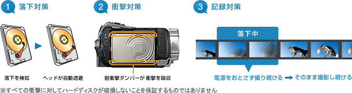 落下/記録/衝撃それぞれに対策を備え、3つの保護技術で大切な映像を守ります。万が一のときも電源を落とさず、ハードディスクを守りながら映像を途切れなく記録し続けます。