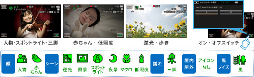撮影シーンを認識。180通りの組み合わせの中から、撮影状況に合わせた最適な映像が取れるように自動設定。いつでもだれでも、美しい映像が残せます。