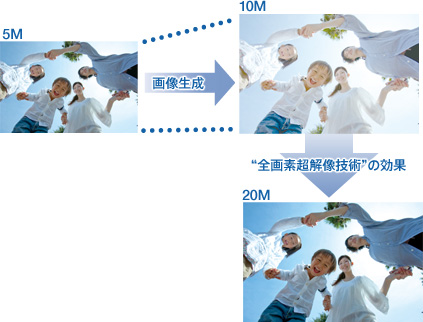 「全画素超解像技術」により、静止画までも驚くほど鮮明に再現します。対象の画素だけでなく、周辺の画素も含め分析し、その結果とデータベースに蓄積されたパターンを組み合わせ、各画素に最適な処理を施すことで、さらなる高画質を実現。2,040万画素の最大約4倍(*)という緻密で高精細な画像が得られます。