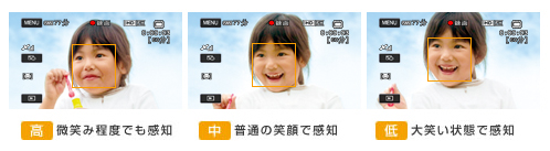 ふとした微笑みから大笑いまで、笑顔を感知する感度を3段階に設定できます。