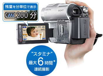 バッテリーはたっぷり撮れる“スタミナ”最大6時間(*)。しかも、残量が分単位で表示されるので、バッテリー交換のタイミングが一目でわかり、撮影中のバッテリー切れを防げます。