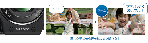 映像のズームに連動して、音声もズーム。離れた人物の声や、動物の鳴き声などをしっかり録音。思い出のシーンを臨場感いっぱいに残せます。