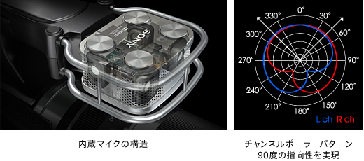 高性能Quad Capsule Spatial Array ステレオマイクロホンを内蔵。4つのマイクカプセル配置を最適化し、感度と音像定位を格段に改善。指向性で100%、SN比で約6dB向上させました(*)。また、外部マイクを接続するためのマイク入力端子、収録音声を確実にモニターできるステレオヘッドホン出力端子も備えています。