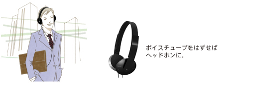 取りはずしたボイスチューブはヘッドホンコードに取り付け可能。音楽を楽しむ時にじゃまにならず、ボイスチューブをなくす心配もありません。