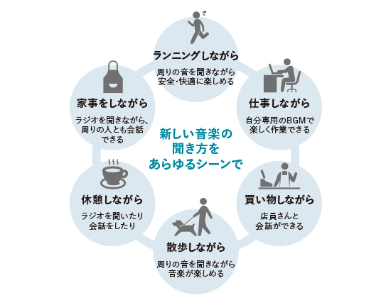 外の音が自然に聞こえるため、車や歩行者にも気を配れ、安全にランニングを楽しめます。スポーツに限らず、散歩中や家事などのさまざまな場面で、コンテンツと環境音が心地よく重なり、解放感を感じられます。
