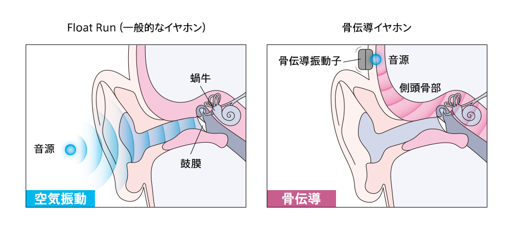 心地よさを感じられるよう、音の広がりと合わせて、聞きなれたサウンドにもこだわっています。骨を揺らす骨伝導タイプとは異なり、一般的なイヤホン同様、耳の前に浮いたスピーカー(ハウジング)から空気を振動させ鼓膜経由で音が聞こえます。また、ランニング中は周囲の音や風切り音が大きくなるため、イヤホンの音量を上げるシチュエーションも多く見られますが、音量を上げても、快適にご利用いただけます。