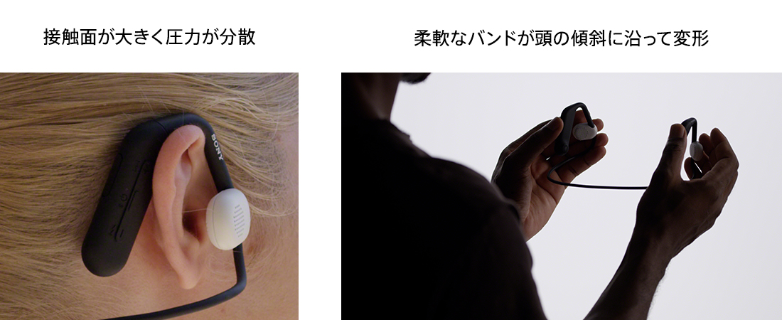 自社が保有する、世界各国の耳や頭部などの身体データを活用した設計により、頭の大きさ・形によらず、フィットしやすいデザインに仕上げました。側頭部との接触面の広さ、横に大きく広がる柔軟なバンド、頭の傾斜に沿いやすい構造により、圧力が分散され、圧迫感が少ないイヤホンとなっています。16mmと大型なスピーカーを搭載しつつ、設計上必要最小限の構造とすることで軽量化し、軽やかで安定した装着性を実現しました。