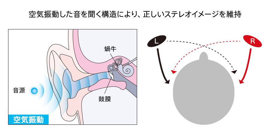 鼓膜経由で空気振動した音を聞く構造により、正しいステレオイメージを維持したまま、自然な音が表現できます。ボーカルの吐息や楽器の余韻まで解像度高く楽しめるので、より豊かなランニング体験を味わえます。