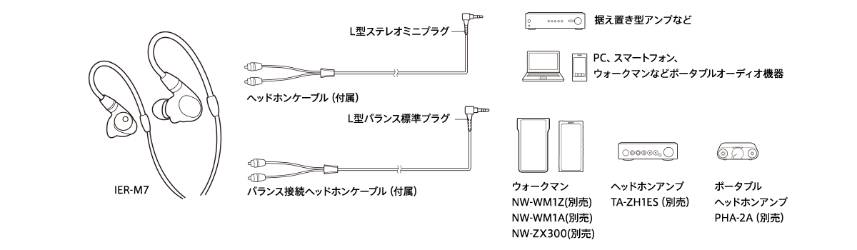 Φ4.4mmのバランス標準プラグを採用し、KIMBER(R)社と協力して開発したケーブルMUC-M12SB1にも対応。Φ4.4mmのヘッドホンバランス端子を採用しているウォークマンNW-WM1Z/NW-WM1AやヘッドホンアンプTA-ZH1ESとバランス接続をすることが可能です。