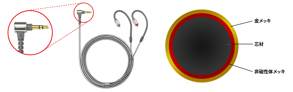 非磁性体のメッキを施したプラグを採用(ヘッドホン側、機器側)。通常の磁性体メッキのプラグに比べ、電流の流れを阻害しにくいため、よりクリアな音質を実現します。