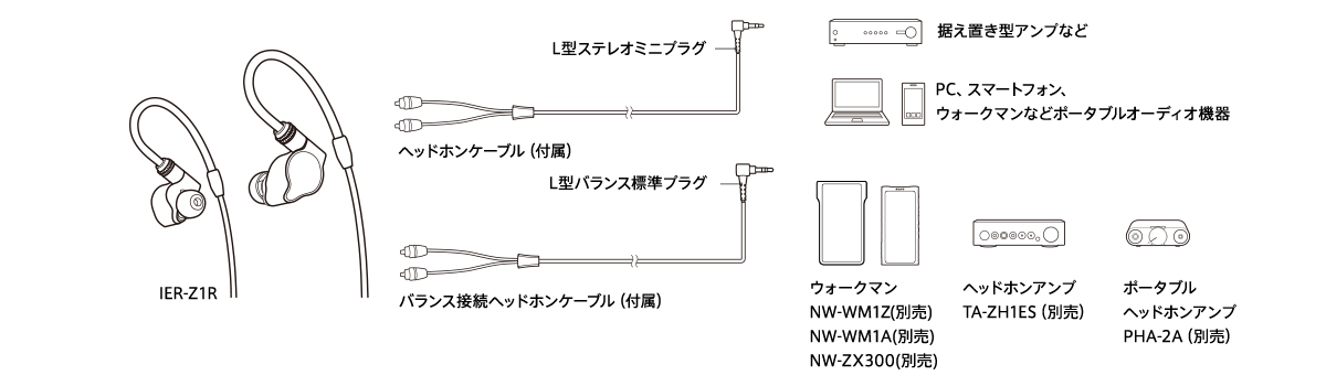 Φ4.4mmのバランス標準プラグを採用し、KIMBER(R)社と協力して開発したケーブルMUC-M12SB1にも対応。Φ4.4mmのヘッドホンバランス端子を採用しているウォークマンNW-WM1Z/NW-WM1AやデジタルミュージックプレーヤーDMP-Z1、ヘッドホンアンプTA-ZH1ESとバランス接続をすることが可能です。
