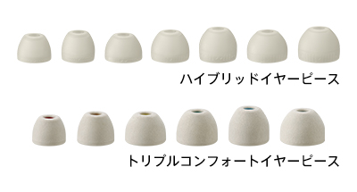 2種類の硬度のシリコンゴムに独自開発のシリコンフォーム素材を組み合わせた、独自開発のトリプルコンフォートイヤーピースを6サイズ付属。今までにない柔らかさと追従性で、高い遮音性と長時間の快適な装着性を実現します。また、水洗いできるので清潔に使用できます。ハイブリッドイヤーピースは7サイズ同梱し、合計13種類からお選びいただけます。