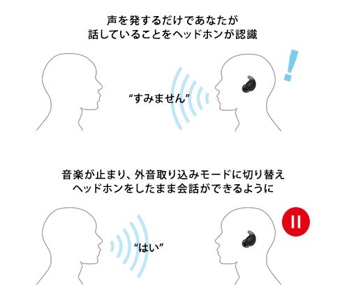 音楽を聴いている最中でも、話したいときに声を発するだけで音楽再生を一時停止し、外音取り込みモードに切り替え、手を使うことなくイヤホンをしたまま会話が始められます。イヤホンが装着者の声を振動検出により周囲の音から区別・認識し、スピーク・トゥ・チャットが起動します。従来モデルよりも声の取り込みを増やして、自分の声がよりクリアに聞こえます。
