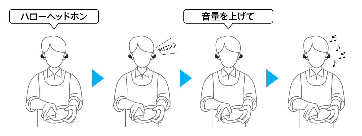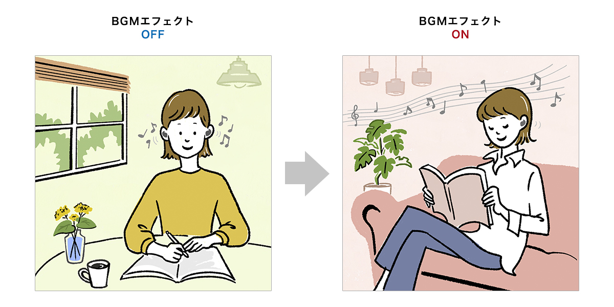 音楽をはじめとしたコンテンツ音が、空間で流れているBGMのように聞こえる機能です。音源が遠くから聞こえるように感じられるため、別の作業をしながらのリスニングに適しています。