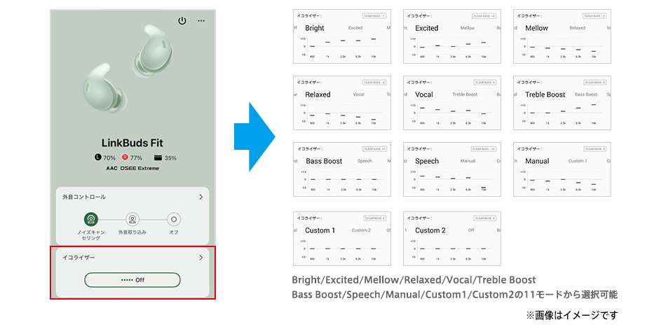「Relaxed」や「Bass Boost」など8種類のプリセットから選択したり、お好みのイコライザー設定にカスタマイズしたりすることが可能です。