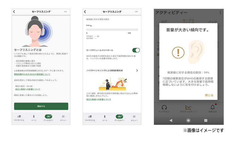 いつまでも楽しく音楽を聴き続けられるように、リスニング傾向が聴覚に配慮されているかを確認できる機能です。イヤホンで音楽視聴中の音圧(音の大きさ)が記録、蓄積され、世界保健機関(WHO)の推奨する限度と比較した結果が確認できます。