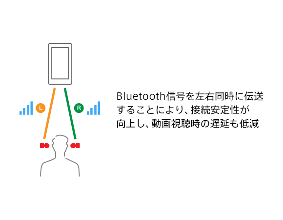 左右同時伝送方式に加え、統合プロセッサーV2により通信アルゴリズムが最適化されることで接続が安定し、周囲に干渉のある環境下でも音飛びがしにくくなりました。動画などの低遅延も実現。
