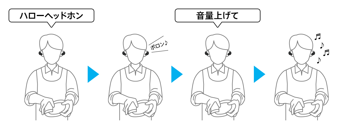 音量調整や再生・一時停止といった操作を、イヤホンに声で指示を出すだけで行うことができる機能です。スマートフォンに限らず、PCをはじめとした様々な接続機器でご利用いただけます。