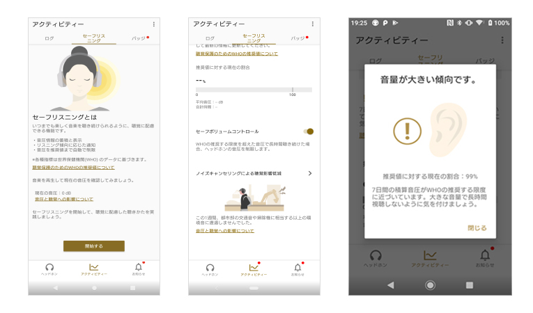 いつまでも楽しく音楽を聴き続けられるように、リスニング傾向が聴覚に配慮されているかを確認できる機能です。ヘッドホンで音楽視聴中の音圧(音の大きさ)が記録、蓄積され、世界保健機関(WHO)の推奨する限度と比較した結果が確認できます。